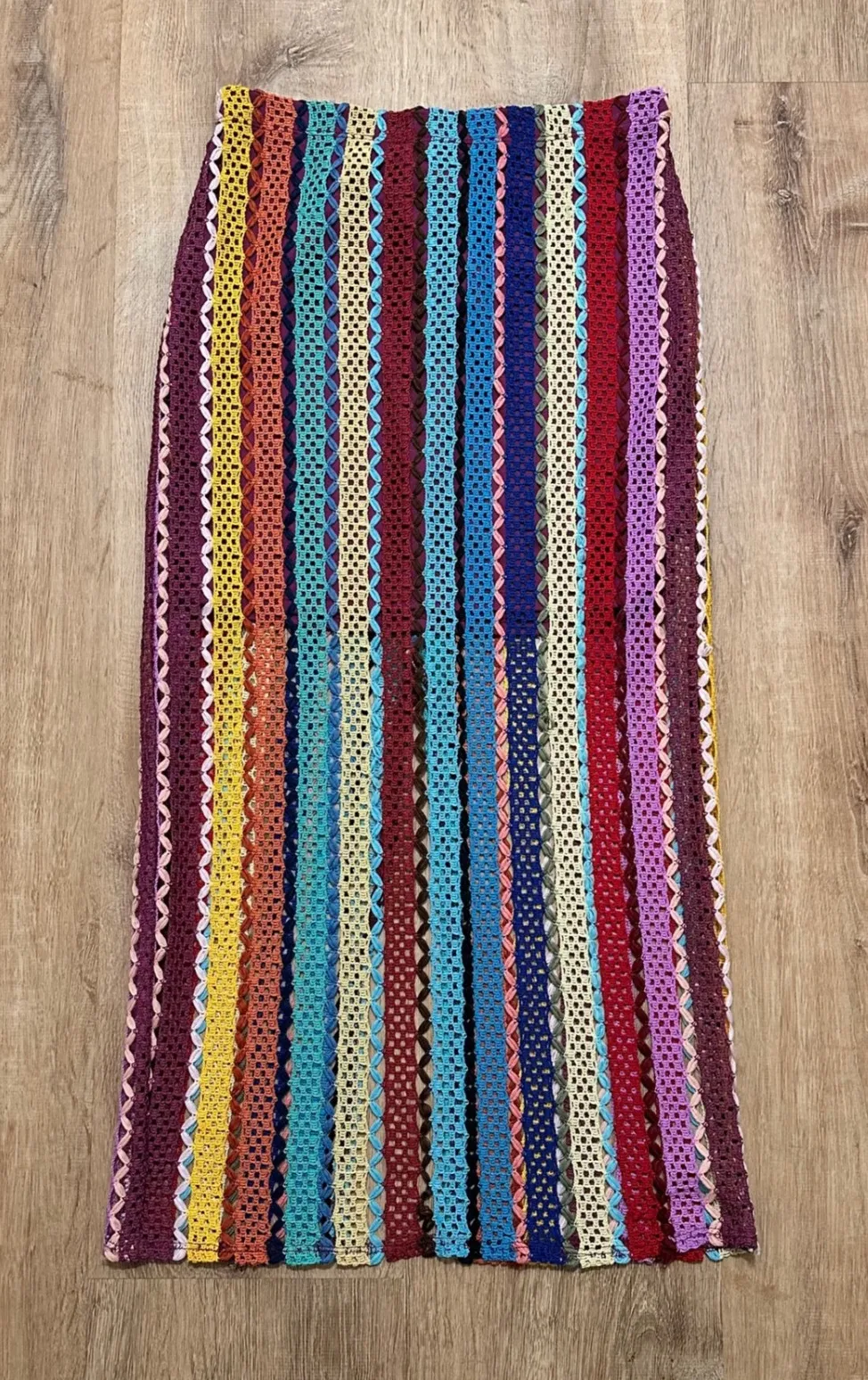 Keywords: crochet skirt, maxi skirt, rainbow stripes, boho, festival wear, summer skirt, knit skirt, artisanal, unique, vintage inspired, colorful, vacation, resort wear, one of a kind, handmade feel