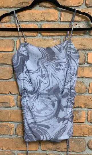Light and darker gray colors Cowl neckline Adjustable spaghetti straps Adjustable ruched sides Lined... Show more