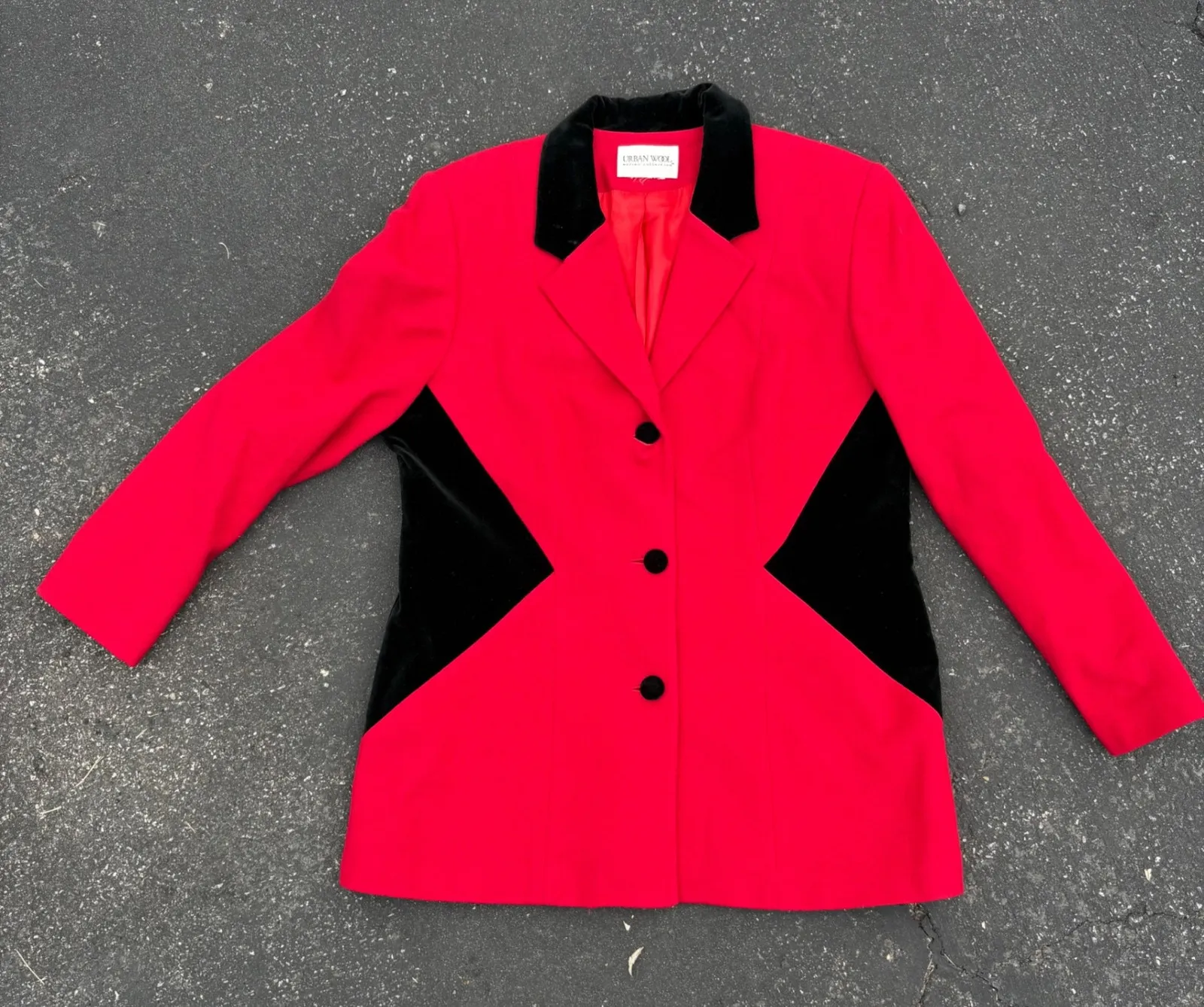 Commanding presence radiates from this bold red blazer. Its vibrant hue immediately captivates, while the contrasting black velvet trim adds a touch of luxurious sophistication. The design is sharp and tailored, with a classic button-down closure and a flattering silhouette. This statement piece elevates your professional attire, adds flair to your everyday wardrobe, and brings confidence to your special occasions. Perfect for a power lunch, a gallery opening, or a chic evening event. wool blazer, red blazer, velvet trim blazer, urban wool, woolmark, womens jacket, career wear, vintage blazer, red wool jacket, black velvet, statement blazer, classic blazer, formal jacket, wool jacket women, red and black blazer