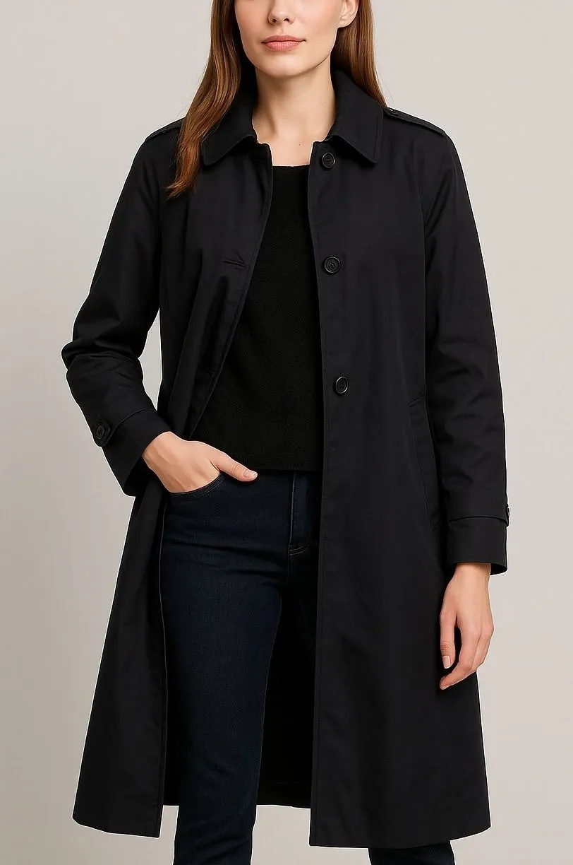 Measurements: • Length: 44 inches • Shoulder: 19 inches Type: Coat Outer Shell Material: Polyester Blend Style: Trench Coat Department: Women Color: Black Lining Material: Polyester Fabric Type: Twill Features: Removable Liner, Water Repellent, Collared, Shoulder Pads Accents: Button Pattern: Solid Jacket/Coat Length: Long Insulation Material: Polyester military | utilitarian | minimalist | classic | trench coat | gothcore | dark academia | streetwear | capsule wardrobe | timeless I ship out items Monday-Friday. • All items come from a pet-free, smoke-free home. • Please compare the measurements to something you already own. Thank you for visiting my store.