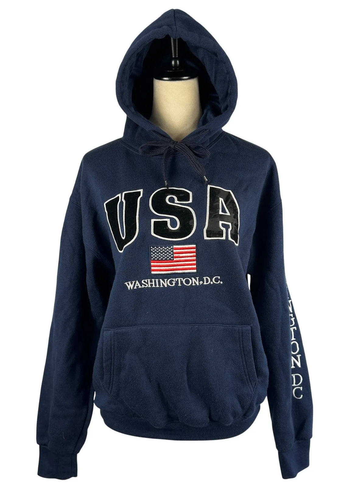 Embrace patriotic pride with this navy blue USA Washington DC hoodie, a perfect statement piece for any casual outing. The bold "USA" lettering across the chest, complete with a vibrant embroidered American flag, instantly conveys a sense of national spirit. "Washington D.C." elegantly arches below, adding a touch of iconic recognition. Detailed embroidery along the sleeve further accentuates the Washington D.C. theme, making this hoodie a unique find. Its comfortable fit and classic design make it ideal for exploring city landmarks, attending casual sporting events, or simply relaxing while showcasing your American pride. Gently used. Keywords: USA hoodie, Washington DC sweatshirt, American flag hoodie, patriotic apparel, embroidered hoodie, graphic hoodie, casual wear, streetwear, travel clothing, souvenir hoodie, comfortable hoodie, navy blue hoodie, size M hoodie