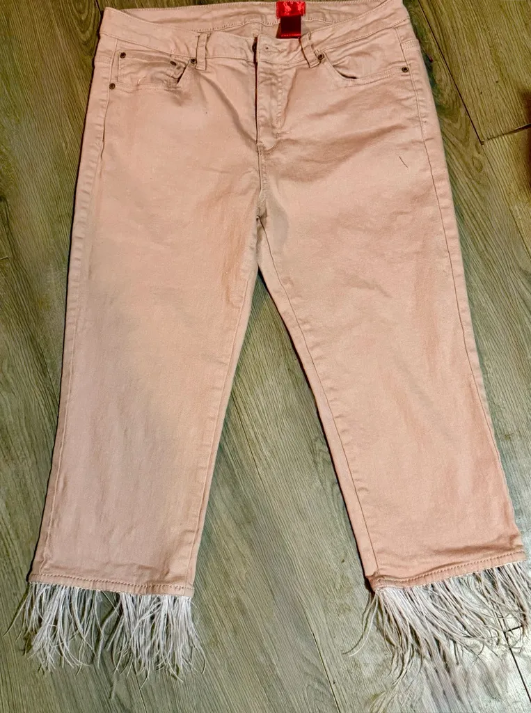 Chic cropped jeans in peach. Features stylish fringe at the hem. Ideal for casual outings.V Christina cropped fringe peach color with white fringe. Every piece this designer makes is unique. That’s why I love this brand. These are a size 12 26 inch inseam 30 adding the fringe. Lightly worn, always hung to dry excellent condition
