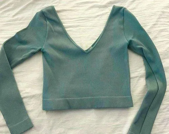 Elevate your style with this chic V-neck ribbed long sleeve top. Perfect for any occasion, this blue top adds a touch of elegance to your wardrobe. One size fits all, but fits like a small