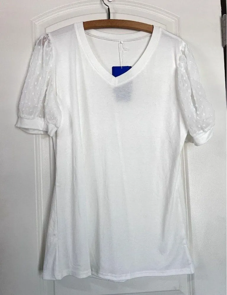 Cute White v-neck top Puff sleeves with polka dots Rayon and Spandex Women's Size Large - s... Show more