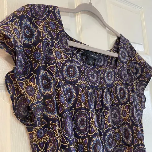 . beautiful silk top with an eye-catching floral geometrical print on a rich purple background. The... Show more