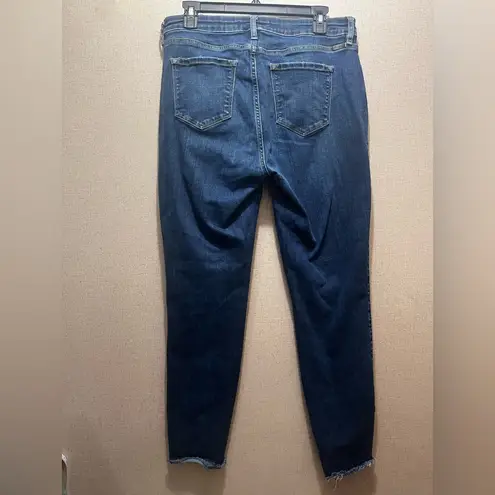 Chic dark blue skinny jeans. Features distressed hem. Ideal for everyday wear. Used good condition