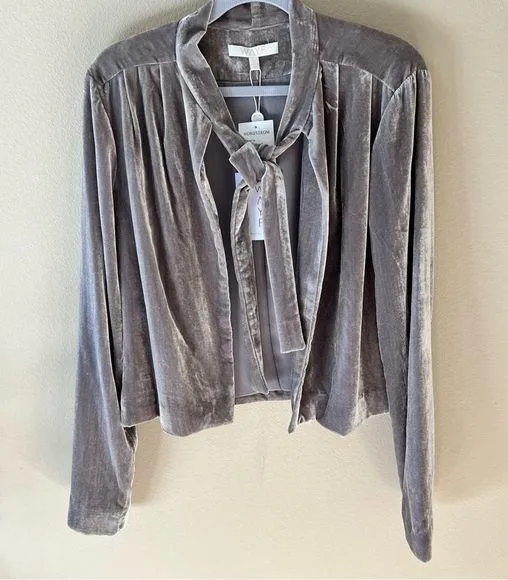 Wayf from Nordstrom women’s velvet open jacket/blouse. Size small. Color on the tag says “pewter” - a beautiful neutral gray/taupe. Open style with tie closure at the neck. Fully lined. New with tags. 70% rayon, 30% nylon (lining is 100% polyester) Made in China Please review the photos and the way in which I measured the garment to determine how it will fit you. Bust: 20.5” Sleeve (seam to cuff): 25” Length: 21.25”