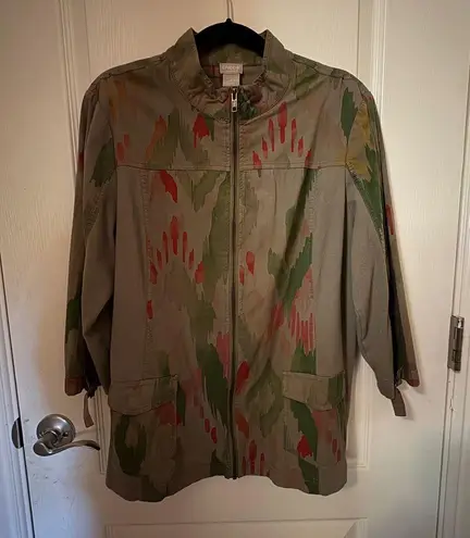 This Chico's utility jacket combines a relaxed fit with a striking green and red color palette, feat... Show more