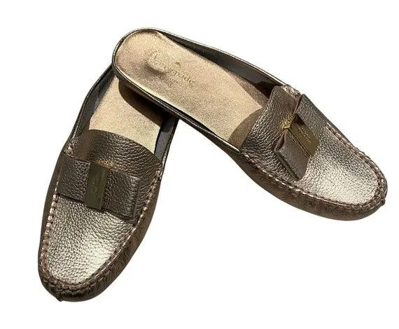 Features: bow, metallic, mules, slip on, driving mocs, gold tone logo plate on bow, leather, flats,... Show more