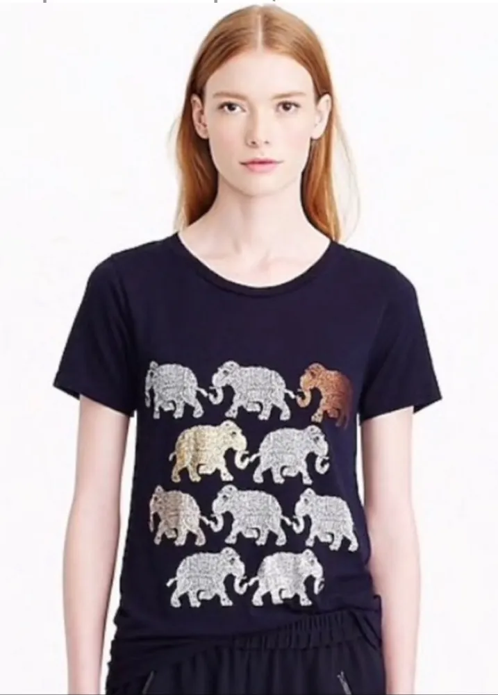 Size small J. Crew blue short sleeve t-shirt Metallic elephant print on front Cotton blend