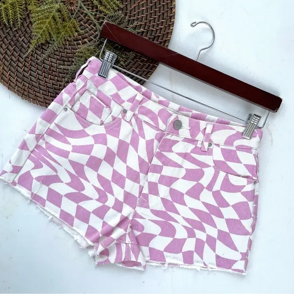 Womens Size 27 Shorts Denim Jean Pink White Whimsical Checkerboard Cut Off High Rise Very Goof Pre... Show more