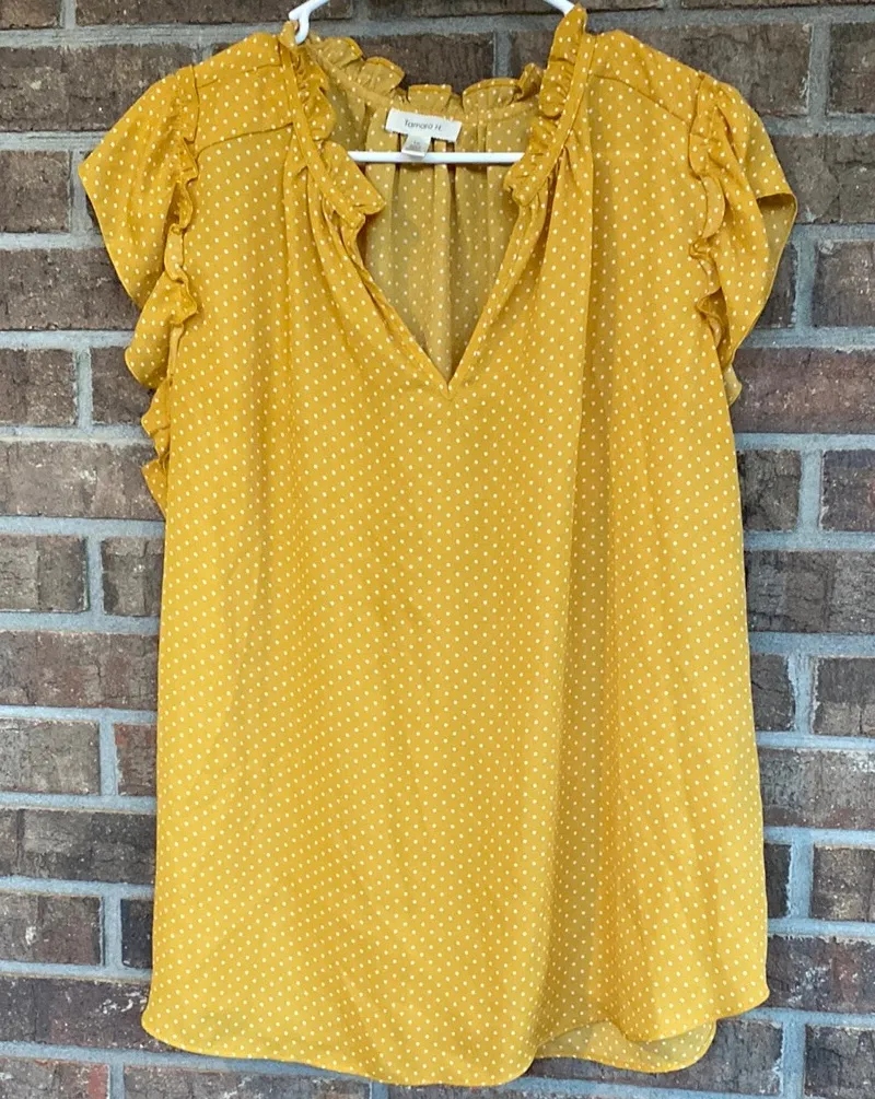 Elevate your wardrobe with this elegant mustard blouse featuring charming ruffle sleeves. Perfect for both casual and formal settings. Measures 23” pit to pit and 28” length-23