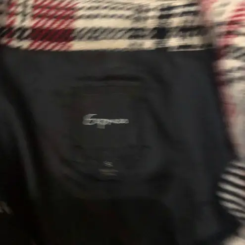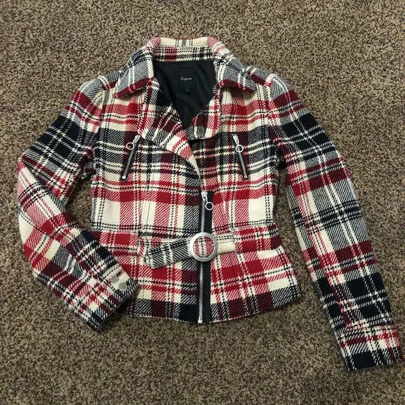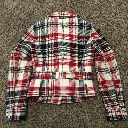 Red/black/cream plaid. Flattering fit with waist buckle. Half zip. Silver accent buckle, zipper and... Show more