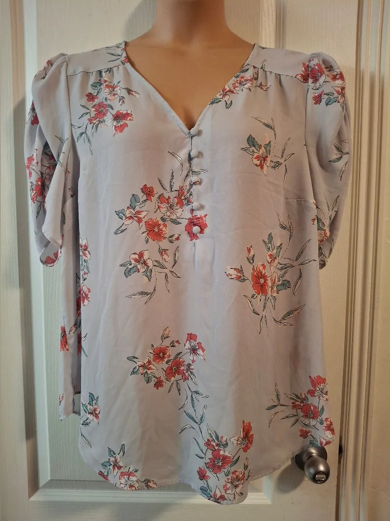 Elegant floral blouse with a button-down front. Perfect for any occasion.