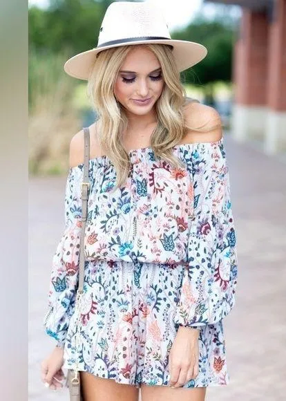 Beautiful grey floral romper Long sleeves Elastic at shoulders to wear off the shoulder Elastic cu... Show more