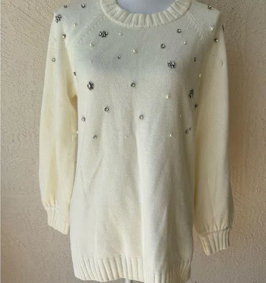 . Pretty faux pearls and dazzling rhinestones elevate this Karl Lagerfeld Paris sweater, bringing fe... Show more