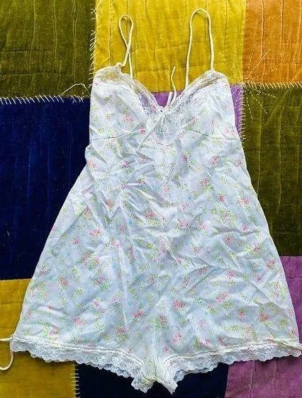 Absolutely adorable vintage sleep teddy/romper by the lingerie brand Barad. Based on the brands label research this is from the 70’s! It’s white with a colorful ditsy floral pattern and lace trim around the edges of the legs and chest. I’m bummed this doesn’t fit me but she will look so cute on someone! In great vintage condition with no flaws that I noticed which is rare with something this old. Definitely gives me cottagecore vibes and is perfect for the spring/summer!