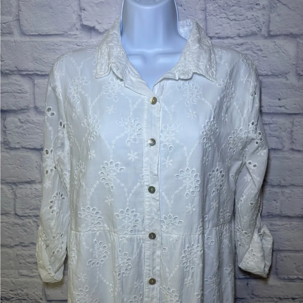 The Valentina Naldi 100% cotton Medium Eyelet Dress is a stylish and versatile piece made in Italy. This white dress features long sleeves, a collared neckline, and button closure, making it perfect for travel, parties, or casual wear. The embroidered accents add a touch of elegance, while the shift style and midi length offer a flattering silhouette. Hand wash only to ensure the longevity of this high-quality cotton garment. Perfect for summer, fall, or spring, this Italian-made dress is a must-have for women who appreciate bohemian and beach-inspired themes. New with tags Underarm to underarm 19 Length 45