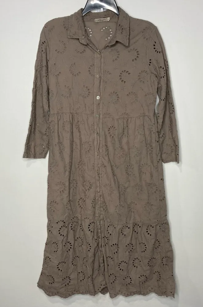 Valentina Naldi Italian eyelet dress Brown/tan/taupe Skirt is lined to the knees size small Very... Show more