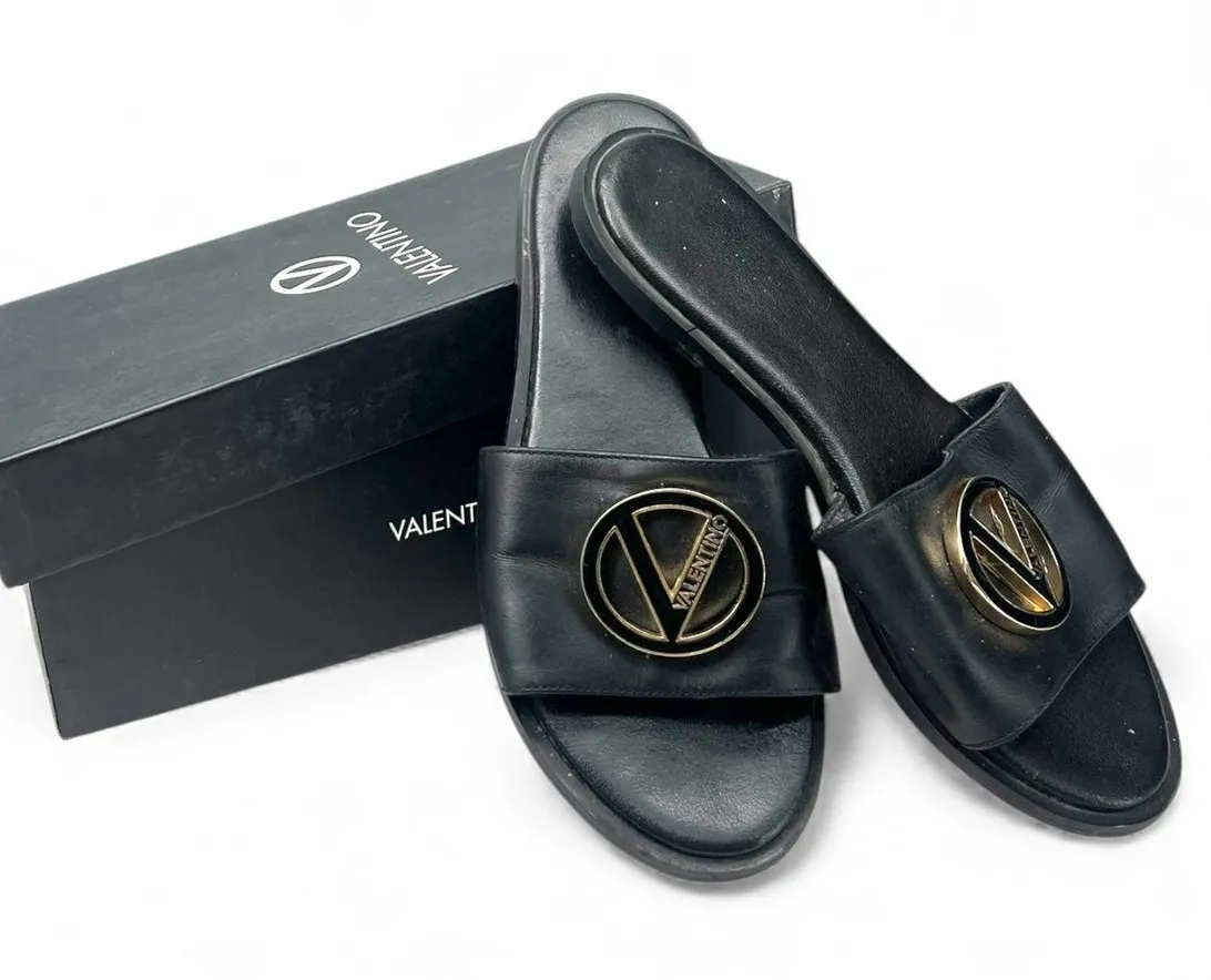 Valentino by Mario Valentino Bugola Slide Sandal in black. This leather sandal features signature logo hardware on the vamp and a slip-on design. Brand: Valentino by Mario Valentino Material: Leather upper and lining, synthetic sole Design: Open toe, slip-on style with a padded insole Note: The item tends to run small in size Gently used, pre-loved item. No significant flaws. Slight scuffing, scratches & typical wear in places as to be expected with normal use.