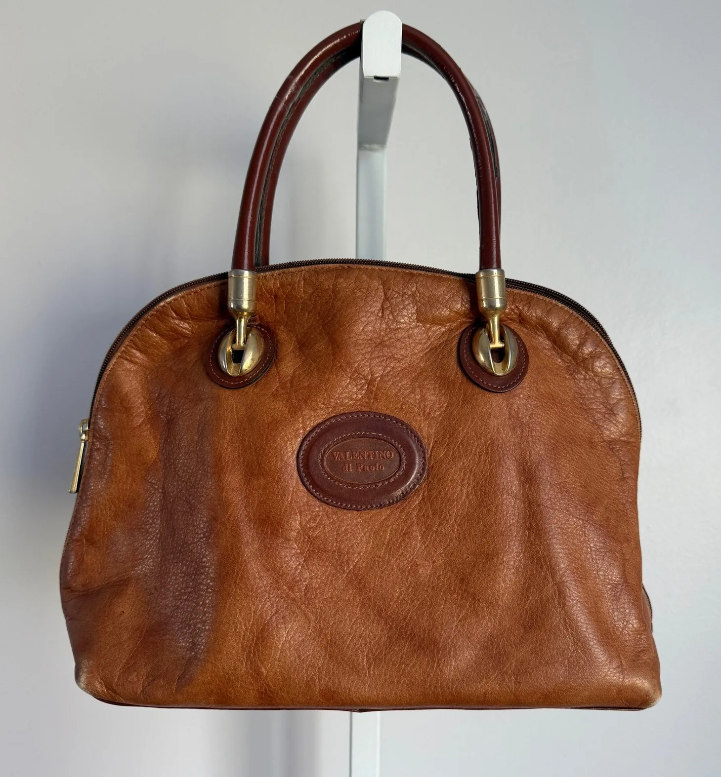 Valentino di Paolo VINTAGE Brown Genuine Leather Dome Satchel Handbag Purse Vintage designer handbag with a touch of class and classic style. This brown leather satchel from Valentino di Paolo features a dome shape, secure zip closure, and sturdy top handles. The exterior is marked with the Valentino di Paolo logo, adding a touch of vintage charm to its design. Measurements: • Width: 17 inches • Height: 9 inches • Handle Drop: 6 inches Keywords: Valentino di Paolo, Leather Satchel, Dome Handbag, Brown Purse, Vintage Handbag, Designer Bag, Top Handle Bag, Gold Hardware, Leather Handbag, Satchel Purse, Vintage Designer, Brown Leather Bag Gently used with signs of wear, as it it is vintage. Previous owner put tape on straps where leather began to crack. Please see photos. Weight: 1 lb 4 oz
