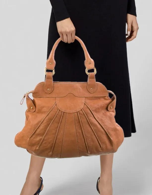 Elevate your collection with this authentic vintage 1990s Valentino Garavani leather satchel, crafted in beautifully aged, high-quality brown leather with signature pleated detailing. This is a rare early-era Valentino design featuring soft, luxe leather and classic brass-toned hardware. The interior includes the iconic red Valentino Garavani leather tag, cream lining, and a secure interior zip pocket. The zipper is an original Riri M8, a premium hardware brand used in high-end Italian luxury goods—an excellent authenticity marker for Valentino pieces from this period. The shape is slouchy yet structured, perfect as an everyday carry, work tote, or collector’s piece. Comfortable rolled leather handles make it an easy shoulder or hand-carry style. Features • Authentic vintage Valentino Garavani • 100% genuine leather in brown • Pleated front panel design • Brass-tone hardware • Dual rolled handles • Premium Riri M8 zipper (authenticity detail) • Interior zip pocket with Valentino logo charm • Cream canvas lining • Red Valentino Garavani leather interior label • Zip-top closure • Slouchy structured silhouette Original RETAIL: $2,750 USD Condition Good vintage condition with gentle wear consistent with age. Leather is soft and supple. Minor marks on the leather and lining, but overall well-maintained for a vintage piece. Measurements (approx.) • Width: 17 in • Height: 13 in • Depth: 4.5 in • Handle drop: 7 in
