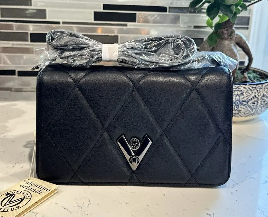 The Valentino Orlandi Black Crossbody Shoulder Bag is a stylish and versatile accessory, perfect for various occasions such as travel, weddings, parties, or casual outings. Made with high-quality natural and synthetic materials, this medium-sized bag features a turn lock closure, gold hardware accents, and a detachable strap. The black exterior with gunmetal diamond quilting adds a touch of sophistication, while the argyle/diamond pattern showcases the brand's unique character. With a lightweight design and adjustable crossbody strap, this limited edition bag exudes an Italian flair and classic designer appeal.