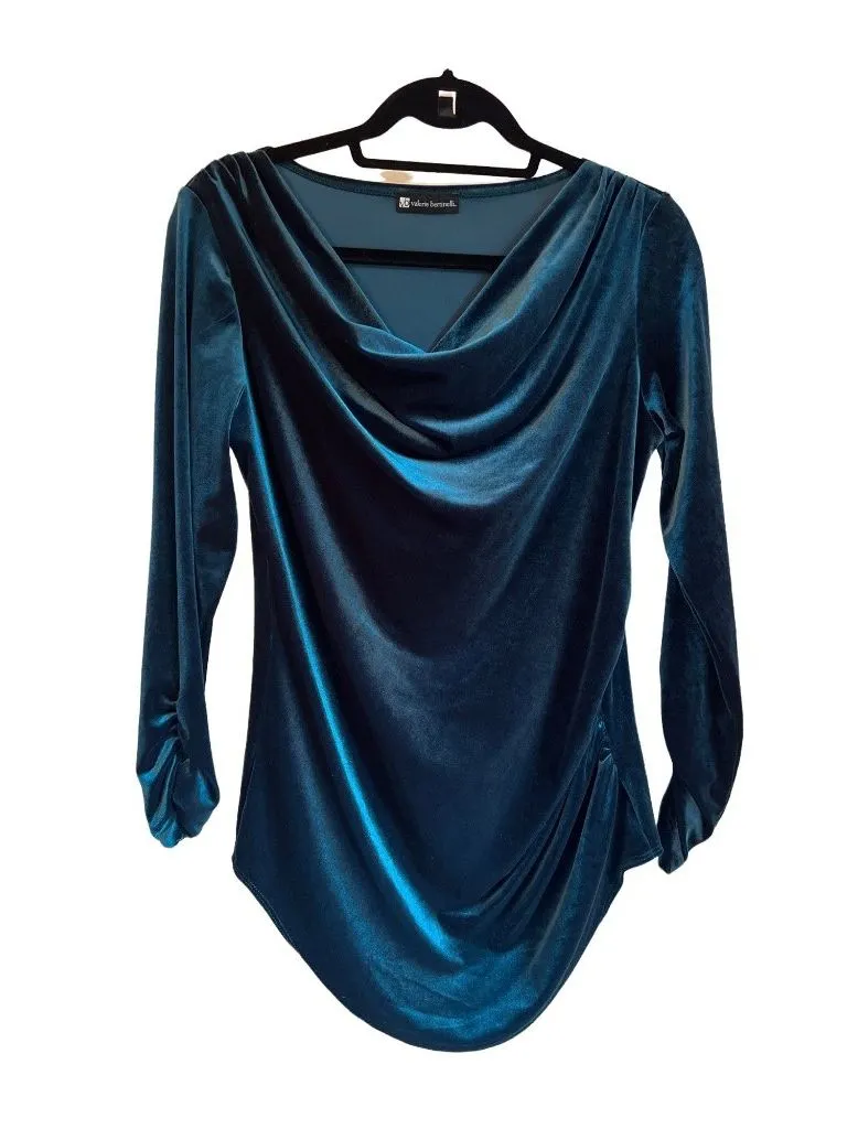 This luxurious teal velvet top is a statement piece that exudes sophistication. With its elegant draped neckline and fitted silhouette, it offers a timeless appeal. The ruched sleeves add a touch of drama, while the soft velvet fabric ensures comfort and style. Perfect for any wardrobe upgrade. • Draped neckline for a flattering fit • Soft velvet material for texture • Ruched detailing on sleeves • Long sleeve design for coverage • Versatile teal blue shade Features: • No Size Tag Please look at measurements • Rouched Sleeve and sides • Slouchy • Blouse • All Season • Velvet Size: Womens M Measurements are Flat Lay and Approximate: Bust: 18.5 in Armpit to Bottom: 15 in Shoulder to Bottom: 25 in Sleeve Length: 22 in Condition: Pre-Owned Good Great Pre Loved Condition Smoke Free * Dog Friendly Home 14 - 1760 teal velvet top, long sleeve shirt, ruched sleeve top, teal blue clothing, velvet blouse women, elegant velvet top, teal draped neckline, chic women's top, blue velvet shirt, valerie bertinelli shirt, women's draped blouse, women's wardrobe staple, polished velvet blouse