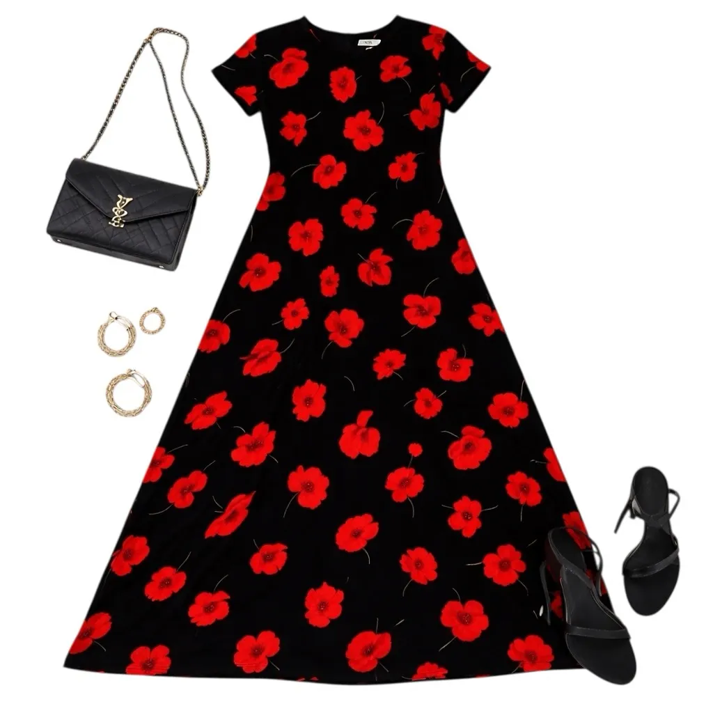 Valerie Stevens NWT Silk Maxi Dress Black Red Floral Poppy Print Size 12 New with tags Valerie Stev... Show more