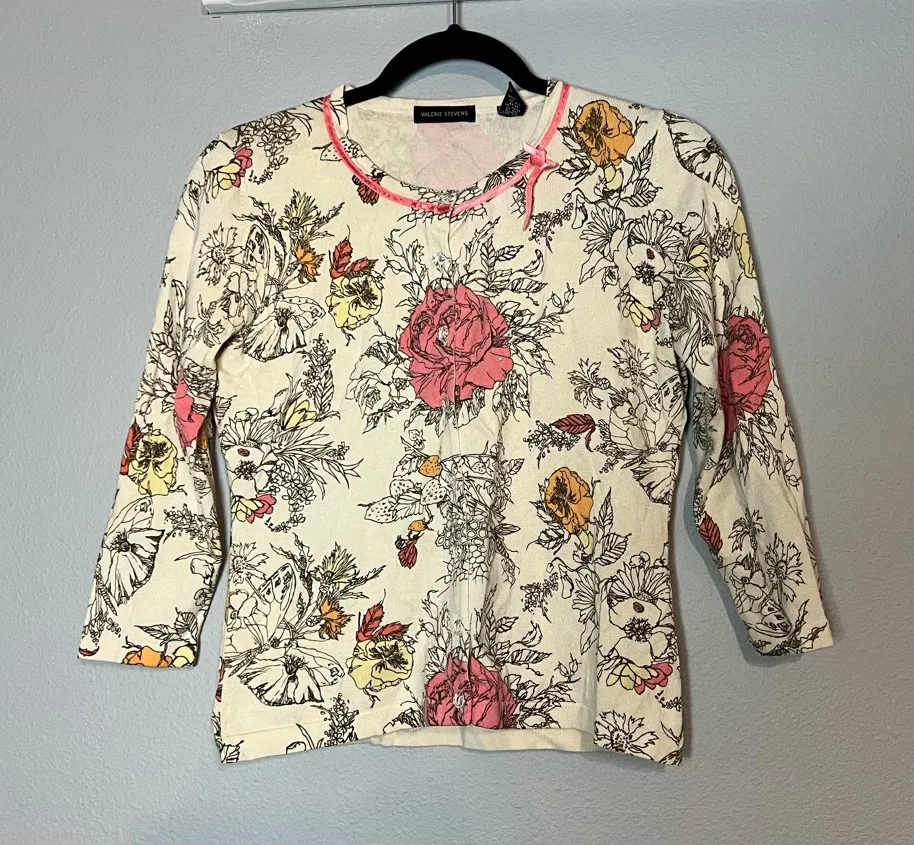 Size Small S 62% Silk 22% Nylon 16% Cotton Lightweight Floral and bee details, pink yellow orange, cream ivory beige off white Preowned condition No flaws to note Sparkle sparkly rhinestones bedazzle detail on buttons and front Armpit to armpit: 18” Length: 20.5”