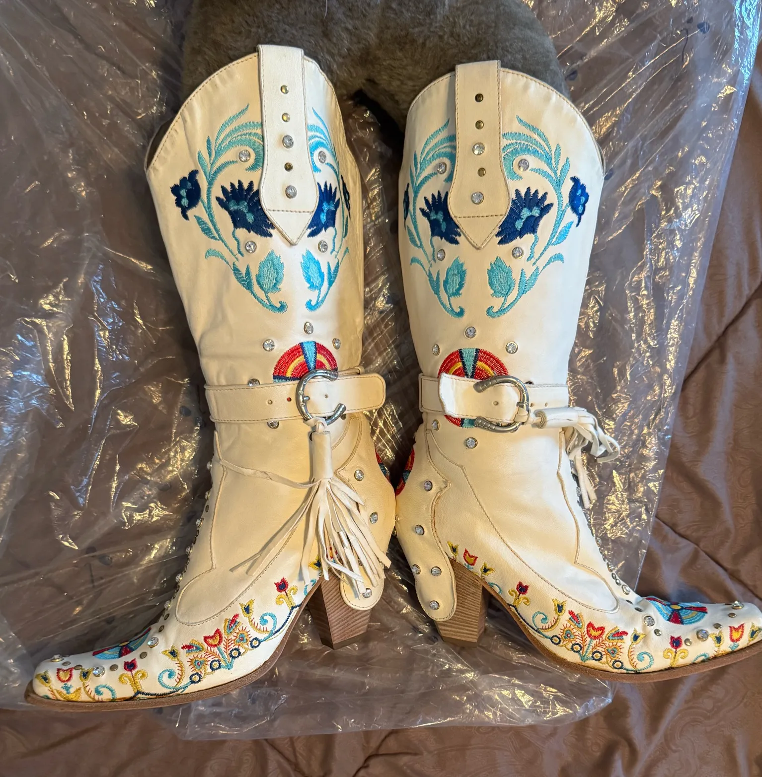 These are from a celebrity closet archival clean out. This incredible find is from Italian couture footwear designer Valerio Giuntoli, for his “El Vaquero” boot line. These are the most incredible, soft, white kidskin leather you have ever felt. The entirety of them is hand stitched embroidered with these beautiful, vibrant colors, and sprinkles of rhinestones. Of unique note is the kidskin leather and embellishment cover, extending all the way down the back of the heel. These have some scuffs and signs of wear, and are missing one rhinestone, which is pointed out here in the photo. These comfortably fit a US size 7.5 or 8 and are sold at his Italian boutique for over $1200. They would be spectacular for festival wear, and truly get you noticed. These are from a celebrity closet archival clean out. This incredible find is from Italian couture footwear designer Valerio Giuntoli, for his “El Vaquero” boot line. These are the most incredible, soft, white kidskin leather you have ever felt. The entirety of them is hand stitched embroidered with these beautiful, vibrant colors, and sprinkles of rhinestones. Of unique note is the kidskin leather and embellishment cover, extending all the way down the back of the heel. These have some scuffs and signs of wear, and are missing one rhinestone, which is pointed out here in the photo. These comfortably fit a US size 7.5 or 8 and are sold at his Italian boutique for over $1200. They would be spectacular for festival wear, and truly get you noticed.
