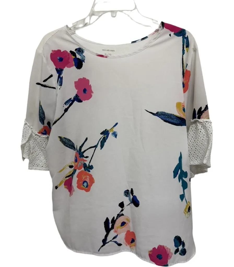 Van Heusen White Floral Semi Sheer Lace Trimmed Floral Top Size XL Watercolor - $18 - From Hannah