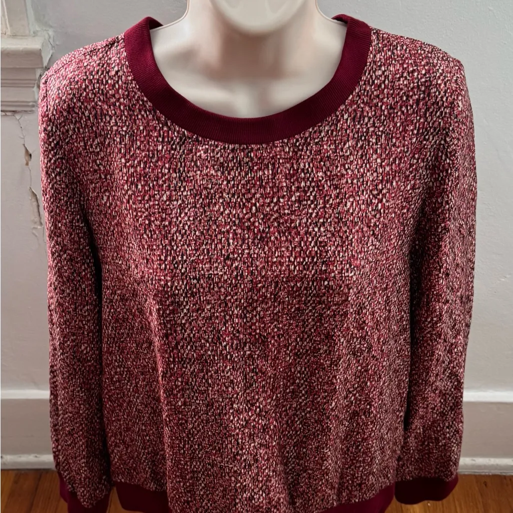 Stay cozy and stylish with this maroon knit sweater. Perfect for any occasion. This breathtakingly beautiful top features long sleeves, round neck and red boarders around neck, hem and cuffs. 100% silk Size 36 or size S in USA Made in Bulgaria Excellent condition We always ship the next day