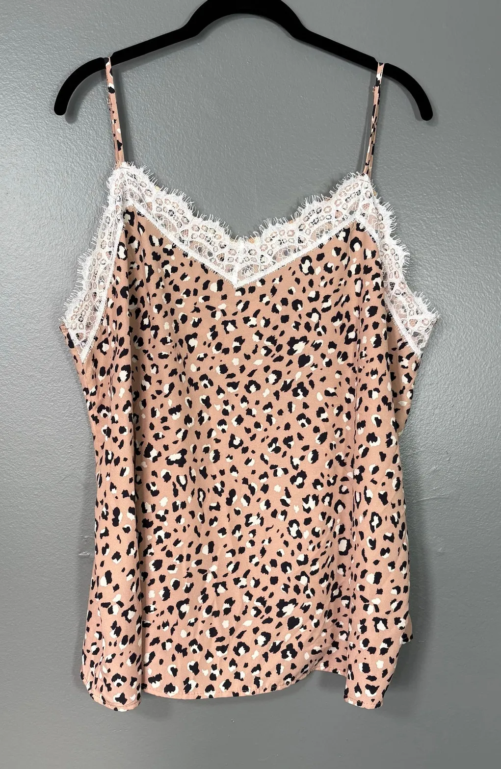 Women's plus size leopard print camisole top by Vanilla Bay. This tan and black animal print tank top has a lace trim at the sweetheart neck, adjustable spaghetti straps, and a sexy y2k look. It is 100% polyester. The top is a size 1X. When laying flat it measures approximately: Armpit to armpit: 22 inches Length: 29 inches The cami is in amazing shape.