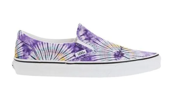 Details: Stand out with these Vans Classic Slip-On shoes, featuring a bold purple tie-dye design. Pe... Show more
