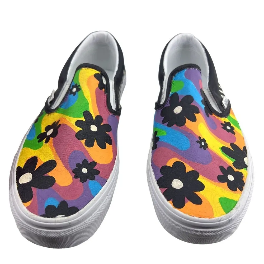 Vans Hand Painted Colorful Psychedelic Black Flower Print Classic Slip On -Super Colorful Funky Pri... Show more