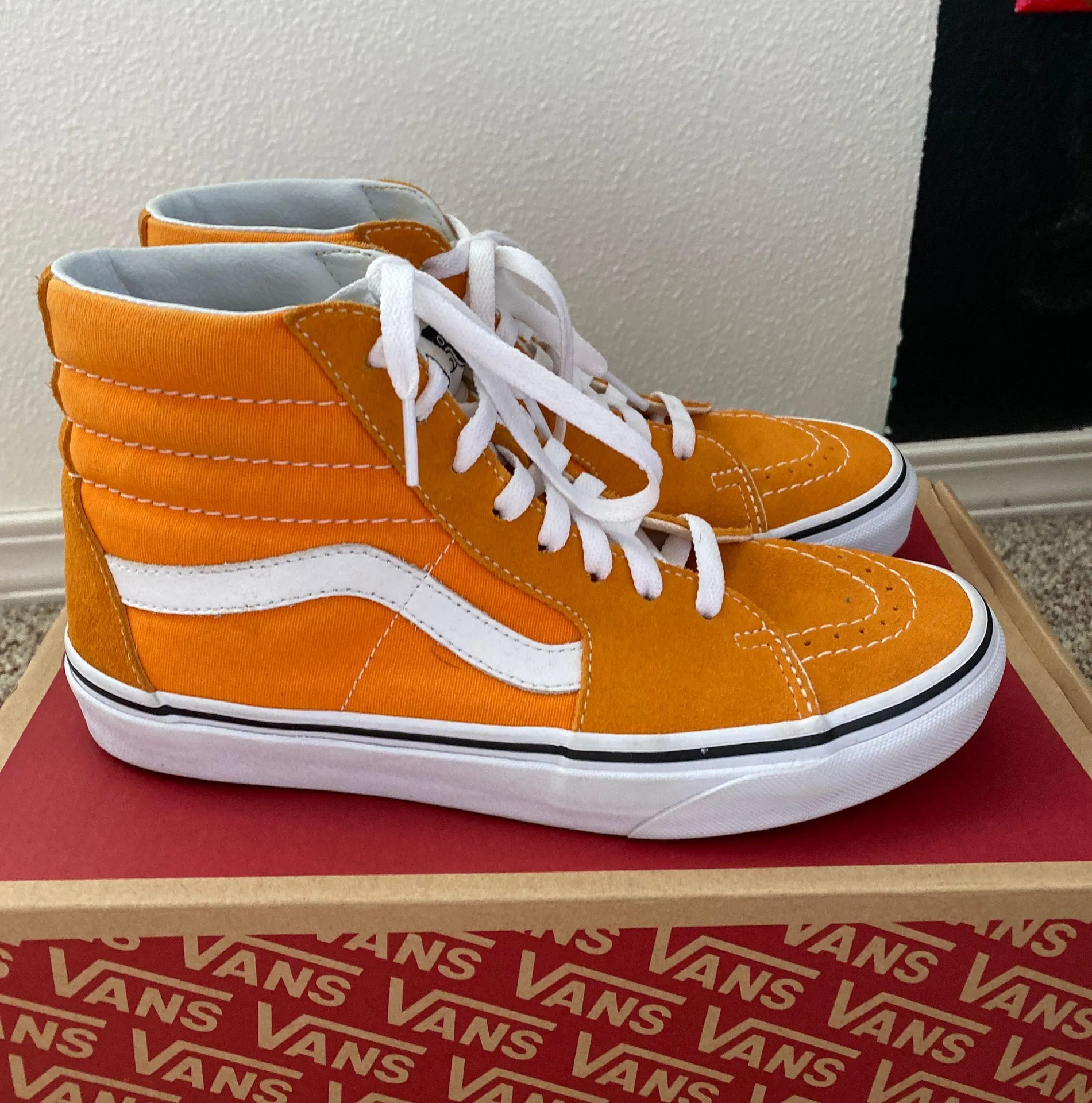 Orange canvas and suede van high tops. Lightly worn but in great condition (no scuffs/marks or stain... Show more