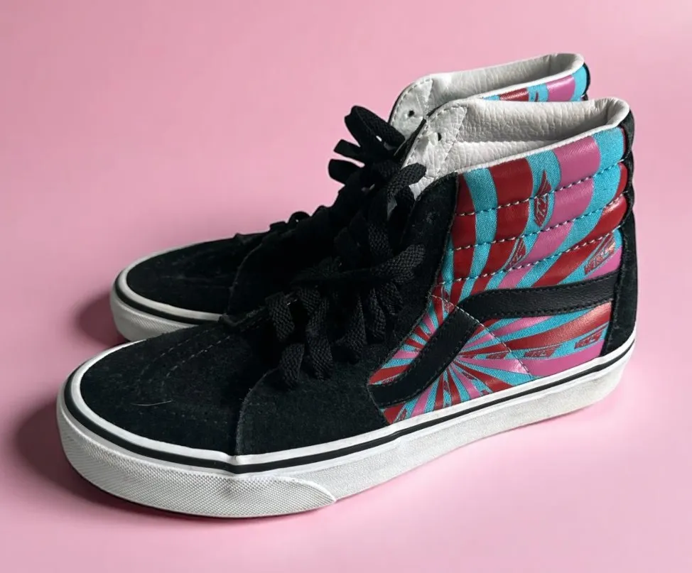 Elevate your style with these VANS hi-top sneakers, featuring a vibrant multicolor swirl logo design... Show more