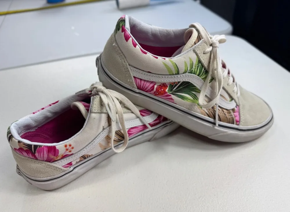 Keywords: Vans Old Skool, Floral Sneakers, Palm Print Shoes, Womens Sneakers, Size 7, Pink Floral Vans, White Suede Vans, Skate Shoes, Casual Sneakers, Summer Shoes, Tropical Print, Womens Fashion