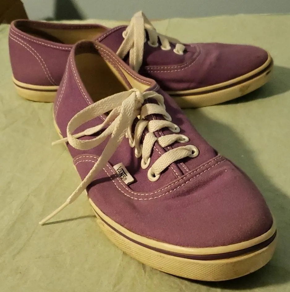 VANS purple low-cut sneakers have white trim and white laces. Women’s size 7.5, Men’s size 6. No hol... Show more