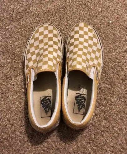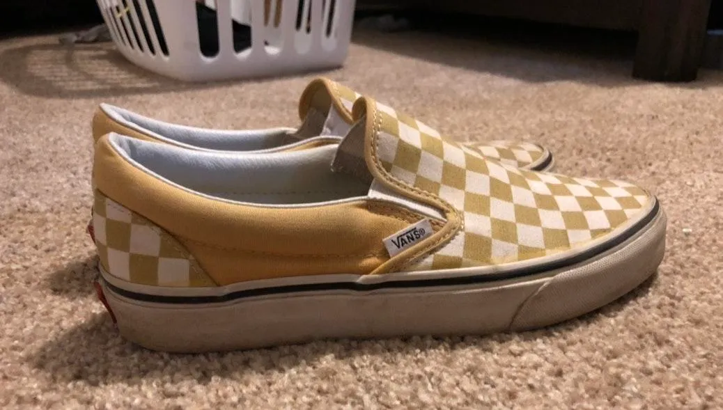 yellow checkered vans slip ons. they’re not the cleanest they have some scuffs and stains but good c... Show more