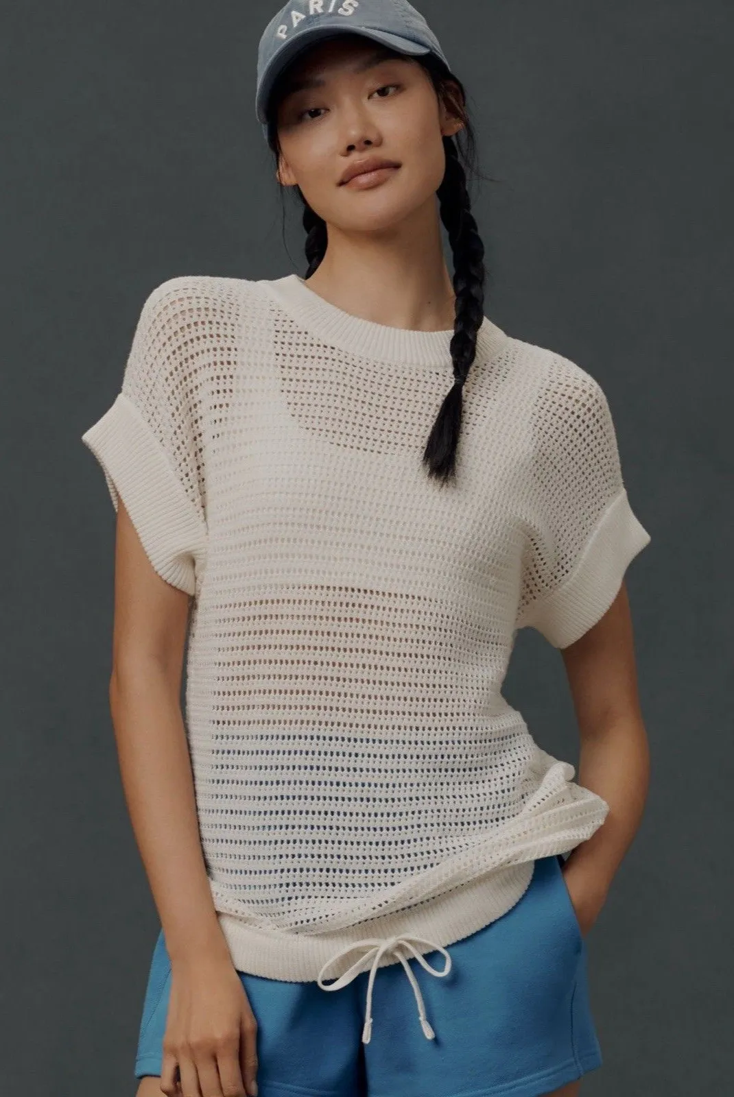 This lightweight layer is crafted in our textured open knit fabric with grown-on short sleeves. It features a classic crewneck and a versatile drawcord hem, perfect for cinching over shorts for a more contemporary, cropped fit.