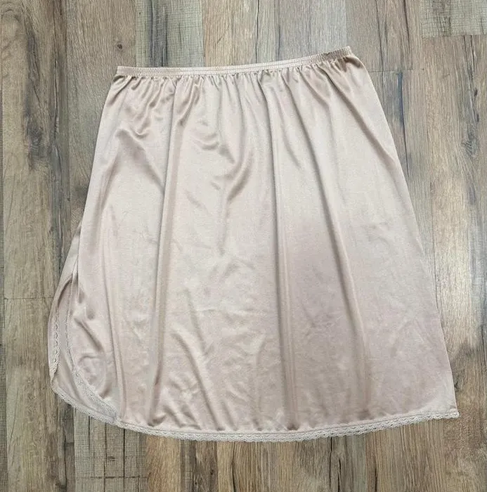 Vassarette women's nude / beige half slip with delicate lace trim hem. Soft, lightweight, and smooth fabric designed to wear under skirts or dresses for added coverage and comfort. • Brand: Vassarette • Size: Small (see measurements) • Color: Nude / Beige • Material: Polyester blend • Style: Half slip / underskirt • Waist: Elastic waistband • Hem: Lace trim detail • Lightweight and breathable • Ideal for dresses, skirts, and sheer fabrics Measurements (approx. laid flat): • Waist (elastic, relaxed): ~13" • Length: ~20" Condition: Good pre-owned condition. No holes or stains noted. Please review photos and measurements for best fit. #vassarette#halfsip#nudeslip#lingerieessential#layeringpiece A/1