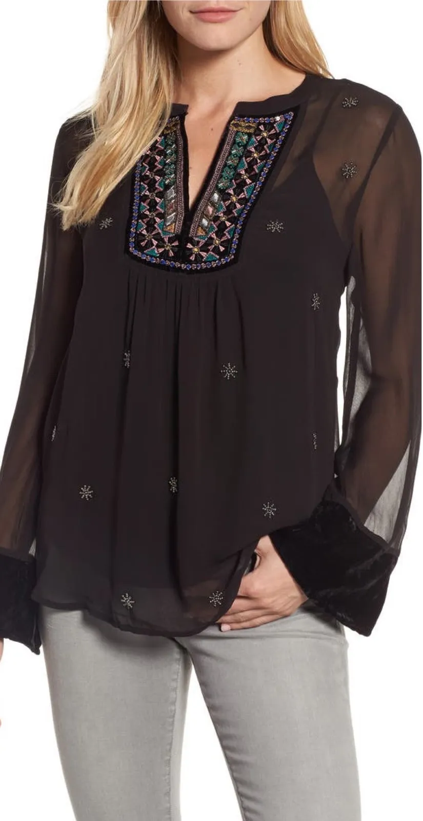 The easy tunic-style blouse gets a rich and romantic upgrade for the holidays in sheer georgette cut with bell sleeves and detailed with beading, embroidery and velvet trim. • Slips on over head • Split neck • Long bell sleeves • Removable camisole liner • 100% viscose MSRP: $189 Excellent preowned condition no rips stains or snags! Keywords: Velvet by Graham & Spencer, black sheer blouse, beaded top, bell sleeve blouse, embroidered top, boho blouse, designer top, XS blouse, women's fashion, evening wear, special occasion top, festive blouse, elegant top, velvet trim, viscose blouse