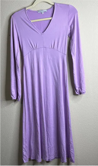 Elegant midi dress in a soft lilac hue, featuring a flattering V-neckline and long sleeves. The dress boasts a subtly fitted bodice that flows into a gently flared skirt, creating a streamlined silhouette. Crafted for comfort and style, this piece offers a sophisticated look with a touch of understated charm. Keywords: midi dress, long sleeve, v neck, purple dress, velvet torch, XS dress, casual dress, rayon dress, fitted bodice, flared skirt, contemporary dress, comfortable dress