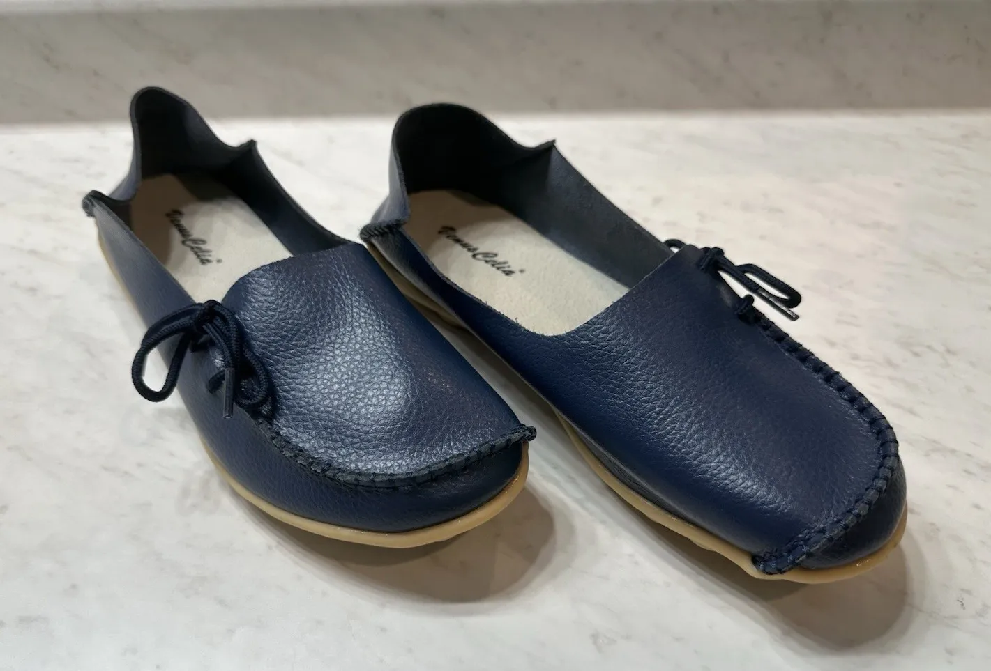Classic and comfortable Venus Celia loafers in a rich navy blue pebbled leather. These moccasin-style flats feature a soft leather upper, cushioned insole, and signature nubby rubber sole for great flexibility and traction. Perfect for travel, driving, or everyday casual wear. Gently worn with minimal signs of use. Women's size 42 EU (approx US 10.5–11). • Slip-on style • Leather upper • Flexible rubber sole with nubs • Color: Navy blue • Size: EU 42 / US 10.5–11 • Brand: Venus Celia • Condition: New without box Keyword: Minimalist, soft leather driving moccasins from Venus Celia in a versatile navy blue. These comfort loafers feature a pebbled leather upper, round toe, cushy insole, and flexible grippy rubber pod sole. Great for cottagecore errands, normcore outfits, or comfy indie walking shoes. Lightweight and practical yet cute enough for daywear.