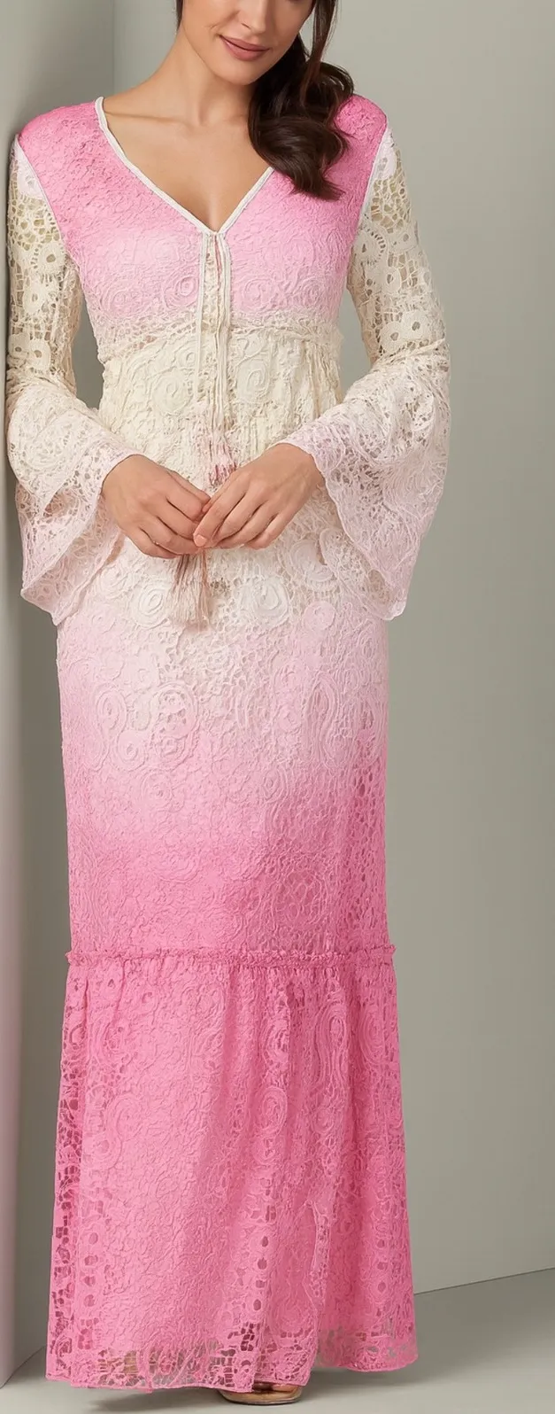 Venus Womens Long Crochet Embroidered Pink White Floral Ombre Maxi Dress sz M Pit to pit 20" Leng... Show more