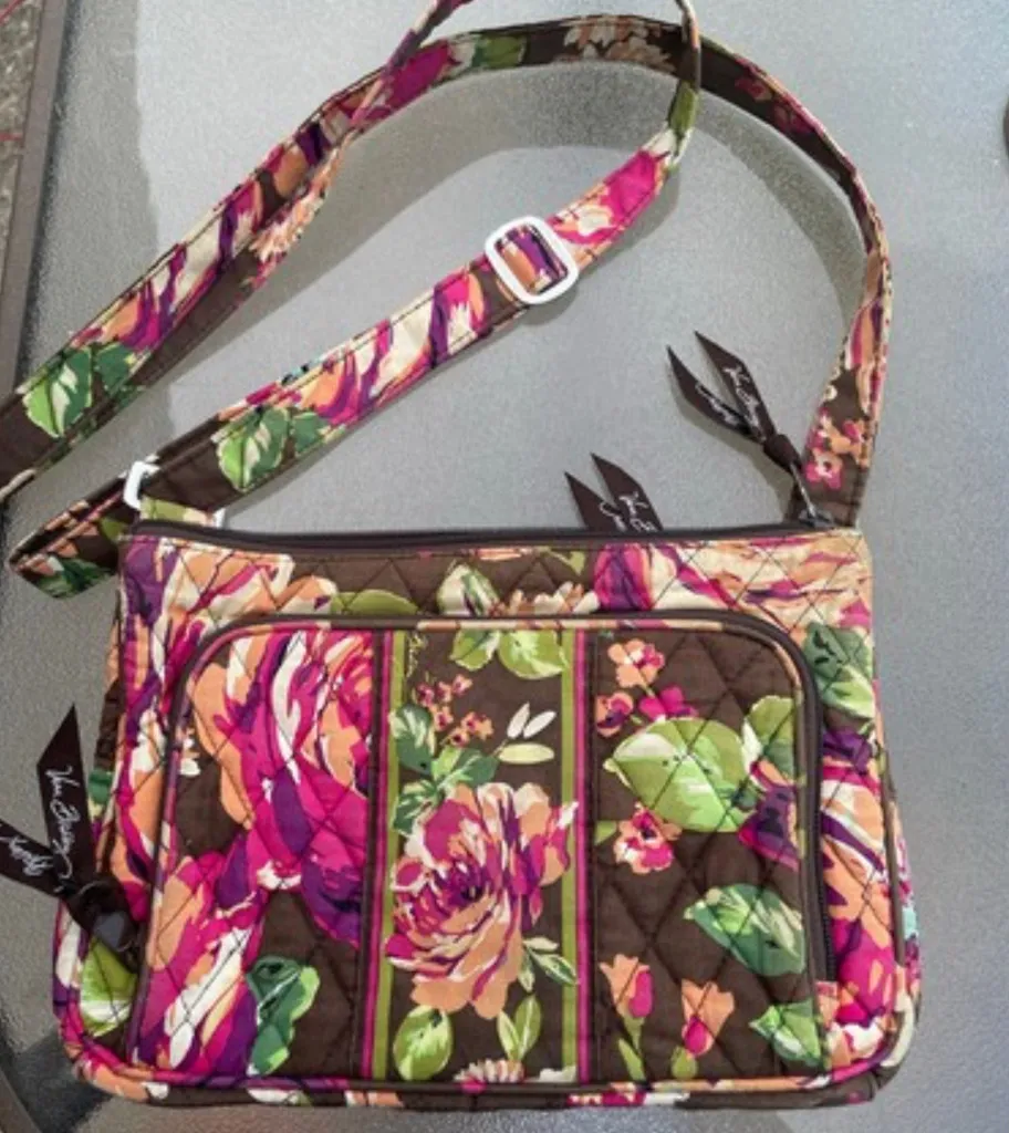 Vera Bradley Crossbody Bag Purse Brown/Pink/Orange Floral English Rose 6x9 in Crossbody. Brown flo... Show more