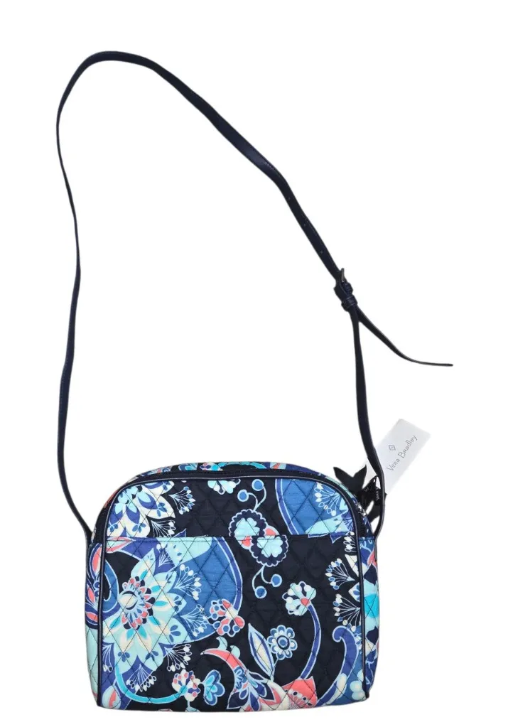 New with tags. Women's Vera Bradley Nwt Lotus Flower Swirl Crossbody Bag Purse Faux Leather Trim. All measurements are approximate width 9.5" height 8.5" depth 1.5" strap drop 22"