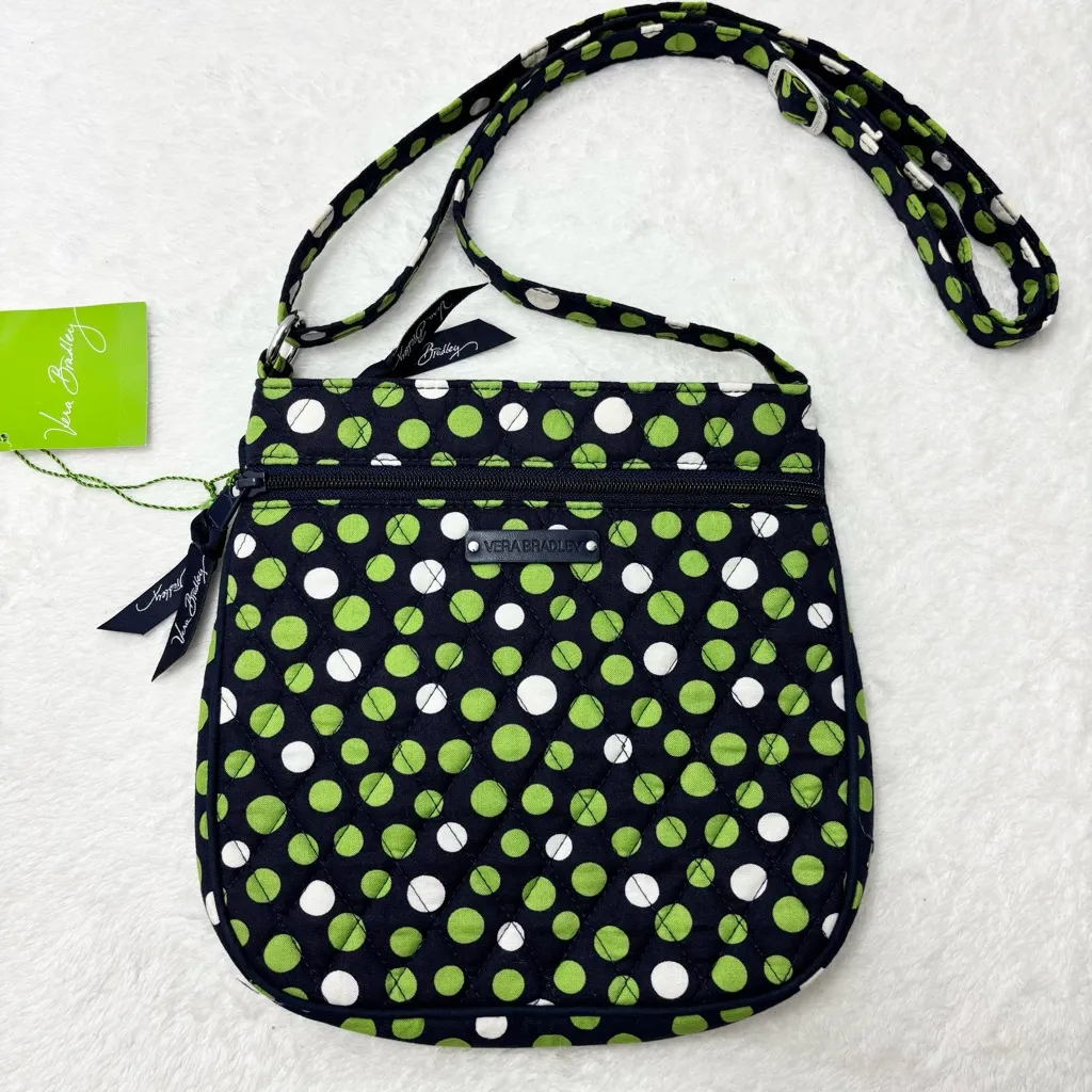 Stylish and functional, this Vera Bradley crossbody bag features a vibrant green and white polka dot... Show more